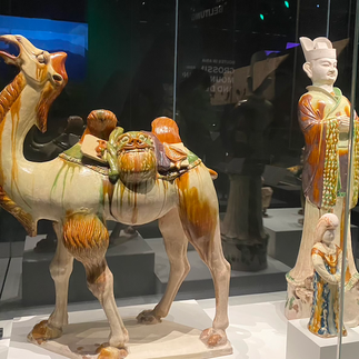 The first object you see is a tiny green Buddha which found its way from what is now Pakistan to an island off Sweden over a thousand years ago. Giant screens with videos of the landscapes provide a backdrop and the key cities, Dunhuang, Samarkand, Baghdad, Constantinople... are signposted in black and white like staging posts.